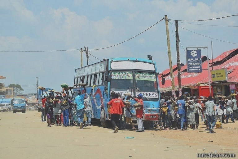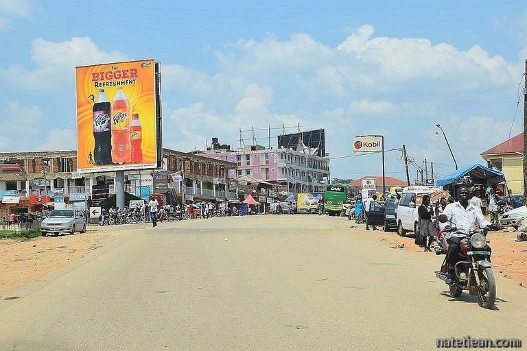 Le lendemain, pour quitter Kampala, nous mettons autant de temps que pour y entrer et presque 4 heures pour arriver jusqu'à la ville de Jinja située à seulement 85 km ; la route est encombrée de camions se dirigeant vers la frontière kenyane. Nous perdons aussi du temps dans un supermarché Shoprite où il y a toutes les marchandises que l'on peut espérer (on se croirait en Afrique du Sud) et où l'on fait quelques réserves.