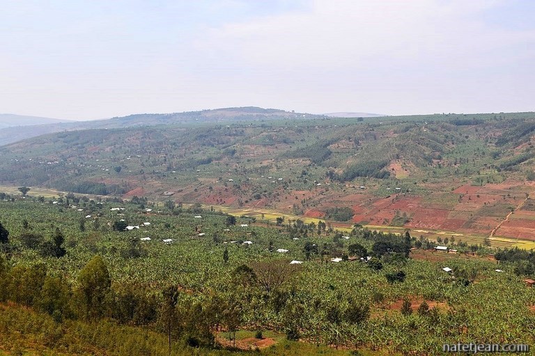 Nous reprenons la route le lendemain pour traverser le parc national de Nyungwe. Avant d'y arriver, nous traversons encore de beaux paysages à quelquefois plus de 2500 m d'altitude. Les bananeraies et les rizières se mêlent maintenant aux caféiers.