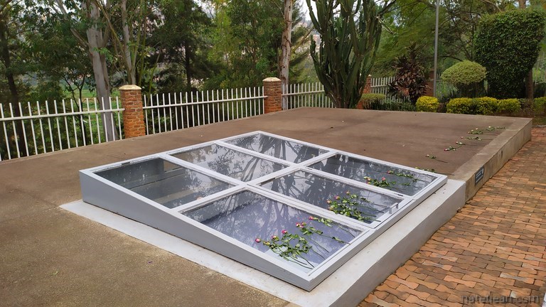 Le matin suivant, nous nous rendons au mémorial du génocide situé à moins d'1/2 heure à pied de l'hôtel. Le Rwanda est malheureusement connu pour le génocide perpétré en 1994 par le gouvernement contre les Tutsis et les Hutus modérés. Ce mémorial, ainsi que les nombreux autres disséminés un peu partout dans le pays, sert à informer sur ce qui s'est passé mais il est avant tout un lieu de recueillement et de souvenir pour les Rwandais. En effet, la plupart des personnes assassinées n'ont pas eu de sépulture et de nombreux corps ont été, plus tard, enterrés ici.
