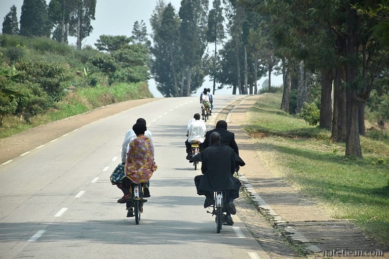 Après une deuxième journée passée à Kigali, nous partons à Huye (Butare) en direction du sud. Les routes sont toujours aussi belles ; ça ne cesse de monter et descendre en fluctuant entre 1700 et 1800 m d'altitude. La population, très nombreuses à pied, à vélo ou à moto, nous accompagne tout le long du trajet. A Huye, en fin d'après-midi, nous nous arrêtons sur un terrain vague qui sert aux écoles de conduite. En ville, comme dans les campagnes, nous nous sentons en totale sécurité pour bivouaquer n'importe où.