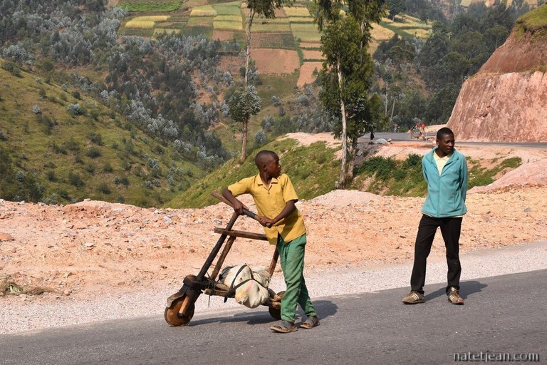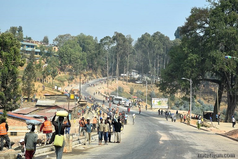Les premiers kilomètres de route sont en construction mais, très vite, l'asphalte remplace la terre et l'on est surpris par l'excellence de la route, par sa propreté (du personnel balaye les bas-côtés en permanence, retirant même les feuilles mortes) et par la qualité des ouvrages ; c'est fait pour durer. Tout de suite après la frontière, on achète une carte sim pour avoir Internet, on retire de l'argent à un distributeur et on se réapprovisionne en fruits et légumes ; en quelques minutes, on a tout ce qu'il nous faut. Pour l'instant, tout nous semble facile au Rwanda. Pourvu que cela dure.