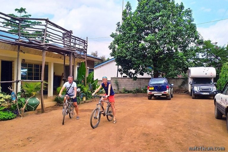 Il ne nous reste qu'une cinquantaine de kilomètres à faire pour arriver à Moshi, ville située au pied du Kilimandjaro d'où partent les treks vers les sommets Kibo et Mawenzi. L'ascension du Kilimandjaro nous avait tentés un temps mais le prix nous a fait changer d'avis (4'800€ pour 2 personnes pour la randonnée de 8 jours avec l'hébergement en tente ; en lodge, c'est plus cher). Cependant, les prix ne dissuadent pas tout le monde puisqu'environ 50'000 personnes gravissent le Kilimandjaro chaque année. Donc pour nous pas de rando mais de courtes balades dans Moshi à vtt généreusement prêtés par le très sympathique propriétaire de la Mountain Bike Guest House où nous restons pendant 2 jours. Ça fait du bien de faire un peu d'exercice !
